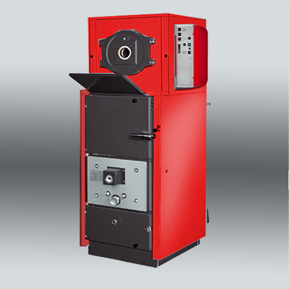 Caldeira a lenha para troncos e barrotes, construída em aço de elevada espessura, com combustão forçada, de gasificação total e painel de controlo eletromecânico standard.