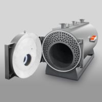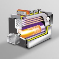 Caldeira pressurizada com inversão de chama, com câmara flutuante desde o modelo 760, corpo de aço para queimadores de gás, gasóleo ou nafta forçados.