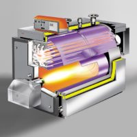 - percurso de fumos de três passagens sem inversão em câmara de combustão com corpo ovalizado (interno)