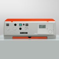 Caldeira pressurizada com corpo de aço a três passagens de fumo internos, para queimadores de gás e gasóleo forçados, forrada em envolvente. Temperatura deslizante até 36°C a gasóleo e 46°C a gás.