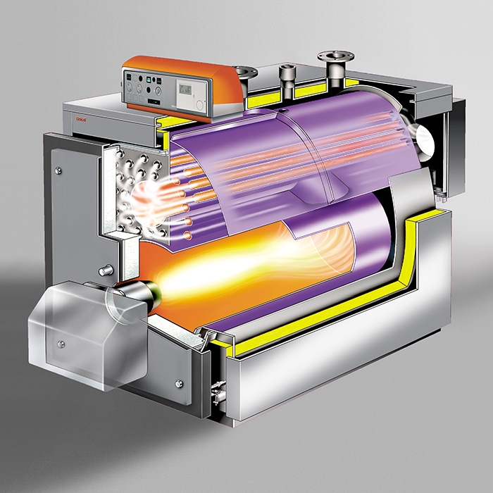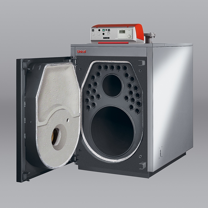 Caldeira pressurizada com corpo de aço a três passagens de fumo internos, para queimadores de gás e gasóleo forçados, forrada em envolvente. Temperatura deslizante até 36°C a gasóleo e 46°C a gás.